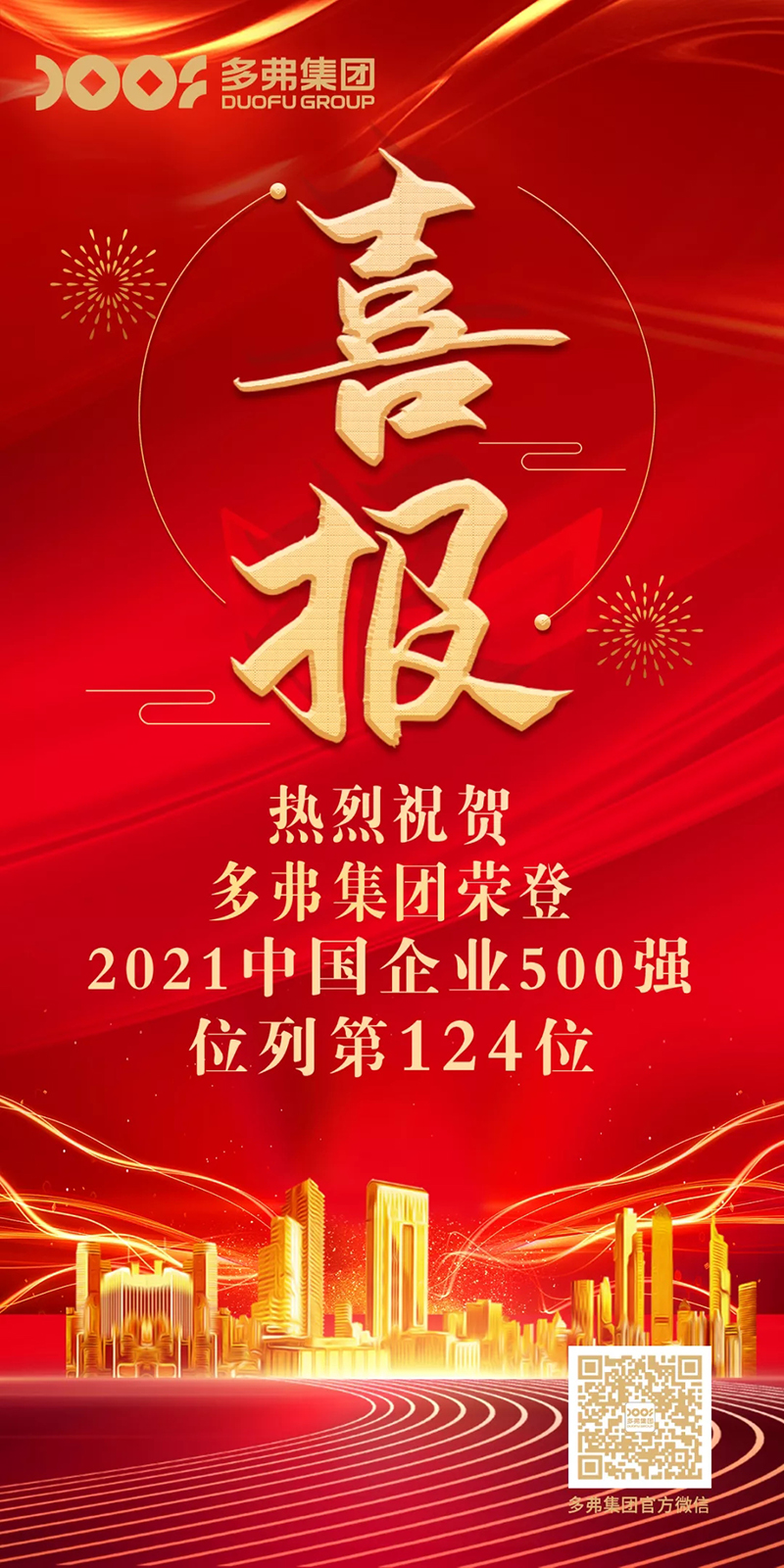在由中國企業(yè)聯(lián)合會、中國企業(yè)家協(xié)會發(fā)布的《2021中國企業(yè)500強》榜單中,首次參評的多弗國際控股集團強勢入圍,榮登第124位,成為中國民營企業(yè)的代表和佼佼者。同時,多弗集團還登榜《2021中國制造業(yè)企業(yè)500強》第49位。
