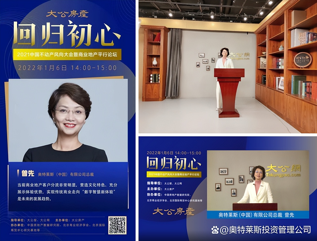 1月6日,由大公網(wǎng)房產(chǎn)頻道聯(lián)合多方機(jī)構(gòu)舉辦的“【回歸初心】——2021中國(guó)不動(dòng)產(chǎn)風(fēng)向大會(huì)暨商業(yè)地產(chǎn)平行論壇”線(xiàn)上直播活動(dòng)正式開(kāi)始。奧特萊斯(中國(guó))有限公司總裁受邀參加本次活動(dòng),并進(jìn)行了精彩的線(xiàn)上直播發(fā)言。