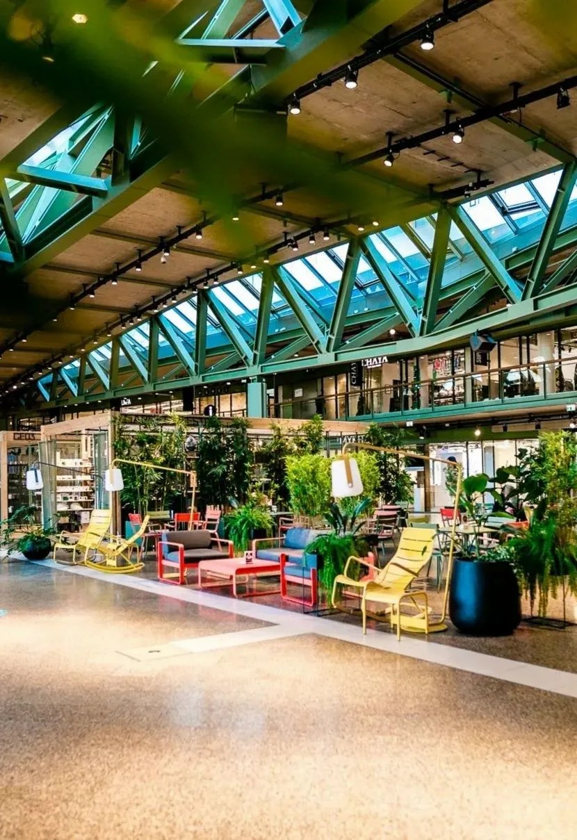 在商業(yè)的二層則設(shè)置了一個開放、通透的公共空間,同柏林潮流酒店25小時(Twenty five hours hotel)進行聯(lián)通。并以城市綠洲為設(shè)計概念,在頂層設(shè)計了一個布滿植物盆栽的七千平方公尺的天臺,供給顧客休憩社交,營造自由、無拘束的商業(yè)氛圍,與項目的整體定位相得益彰。
