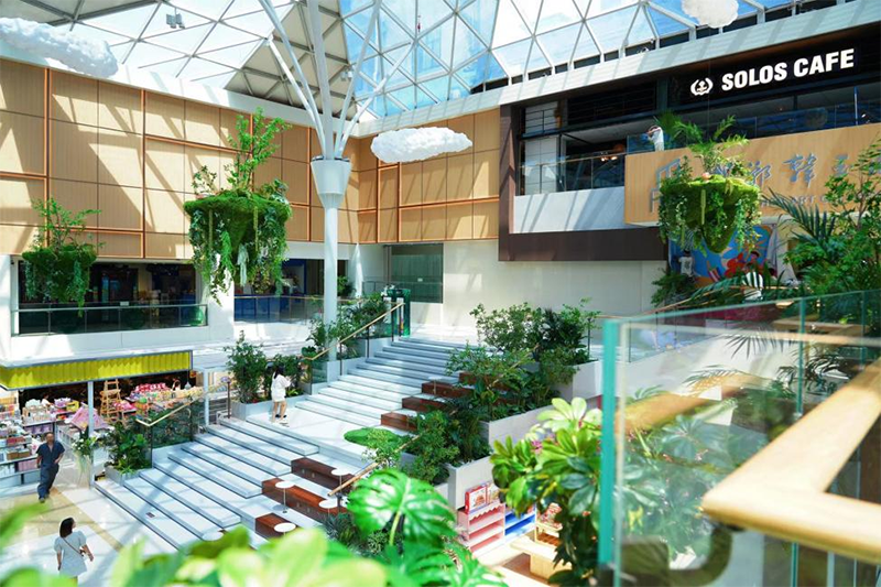 通過填補(bǔ)主中庭和動(dòng)線調(diào)整等手段,設(shè)計(jì)團(tuán)隊(duì)共打造了“云光”“藝境”“SHOW TIME” 、“陽光山谷”四大主題空間,分別對應(yīng)“美妝-云光之下的時(shí)尚美學(xué)”“生活-探尋生活中的靈感意境”“潮&趣-年輕力探索中心”“藝術(shù)-綠色有機(jī)陽光山谷邂逅藝術(shù)與美食”主力場,增強(qiáng)了品類與空間氛圍的聯(lián)結(jié)性,使一二三期動(dòng)線順暢連通,有效拉動(dòng)客流向上走。其中七樓的“陽光山谷”跨層主題空間,將自然生態(tài)的綠植元素和本地的河川山谷地貌滲透其中,把自然河谷的流線設(shè)計(jì)與室內(nèi)整體動(dòng)線的層次結(jié)合,增加了商場的游逛體驗(yàn)。