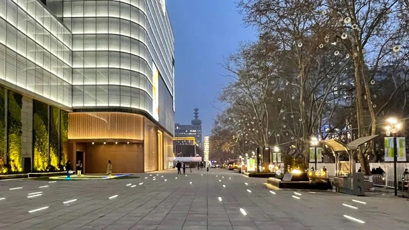 室外兩面的廣場區(qū)域分別被設(shè)計(jì)為憩(水秀廣場)、聯(lián)(商業(yè)步行通廊)、迎(慶典廣場)、趣(彈性劇場)、達(dá)(地面停車場/生活超市)五大部分,每個(gè)部分都將標(biāo)識(shí)、景觀鋪裝、綠植、親水景觀、多媒體藝術(shù)裝置等與建筑整體設(shè)計(jì)風(fēng)格進(jìn)行了統(tǒng)一,融合了現(xiàn)代、藝術(shù)、科技與綠色的室外區(qū)域營造出了宜人舒適的氛圍。