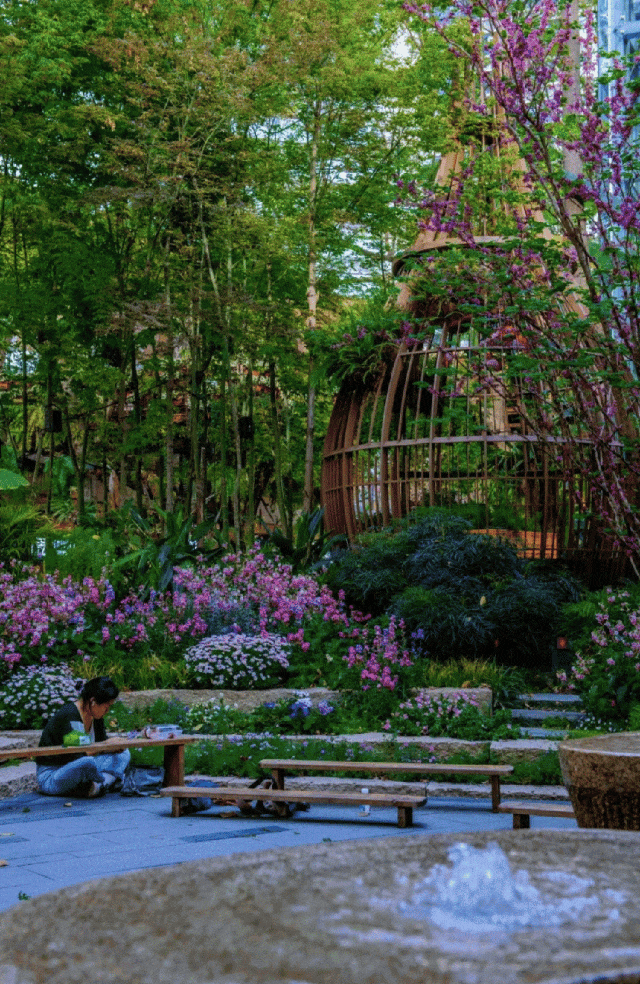 綠樹(shù)蔥蘢、繁花似錦,配合匠心獨(dú)運(yùn)的休憩布局,共同編織出一個(gè)遠(yuǎn)離塵囂的森系都市綠洲。然而,若要深入探討森系商業(yè)背后的成功秘訣,僅僅依靠視覺(jué)上的高顏值是遠(yuǎn)遠(yuǎn)不夠的。更為核心的是,它必須能夠塑造出一種獨(dú)一無(wú)二的文化氛圍與精神內(nèi)核,這種獨(dú)特的文化氣質(zhì)與靈魂,才是讓顧客心生向往、流連忘返的關(guān)鍵所在。