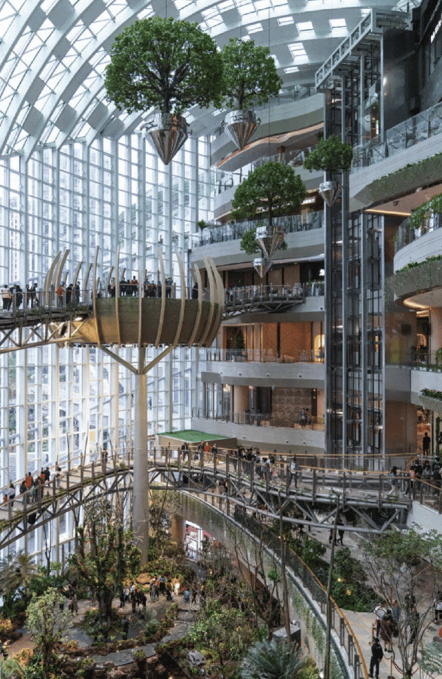 其中,「沐光森林」作為光環(huán)的標(biāo)志性景觀,以其縱跨6層、高達(dá)42米的室內(nèi)立體垂直植物園之姿,成為了眾人矚目的焦點(diǎn)。懸空其間的步行棧道,如同穿梭于綠色世界的秘徑,讓顧客在享受購(gòu)物樂(lè)趣的同時(shí),也能感受到大自然的呼吸。這條懸空跨層步道,不僅巧妙地連接了商業(yè)區(qū)域與森林景觀,更讓每一次購(gòu)物之旅都充滿(mǎn)了探索自然與發(fā)現(xiàn)驚喜的奇妙體驗(yàn)。