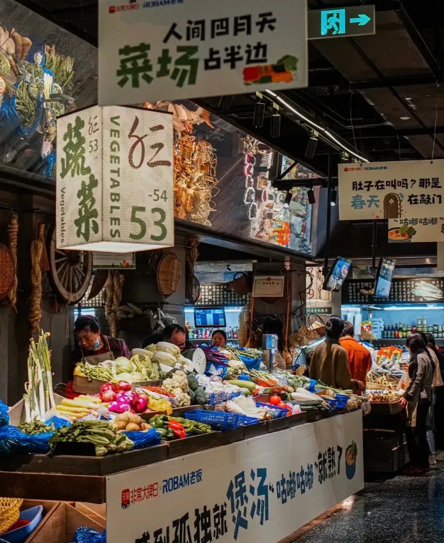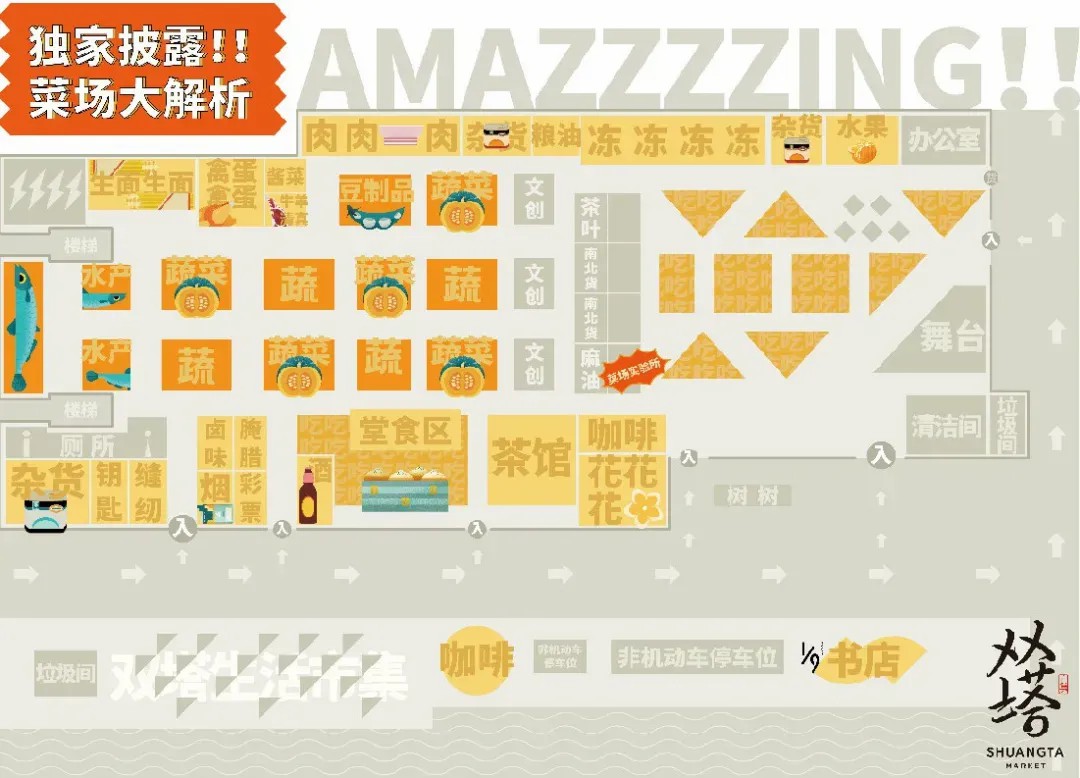 市集經(jīng)過精心設(shè)計(jì)與改造,增設(shè)出入口以增強(qiáng)開放性,并與濱河區(qū)域形成聯(lián)動(dòng),引入多樣化業(yè)態(tài)。蔬菜區(qū)作為核心,被雜貨、糧油及冷凍食品區(qū)環(huán)繞,全面滿足居民購物需求。南側(cè)新增的花店與咖啡館則為市集平添文藝氣息,并配備舒適的堂食區(qū),不僅豐富了市集功能,更彰顯了其現(xiàn)代感與時(shí)尚魅力。