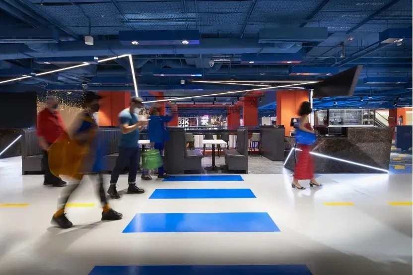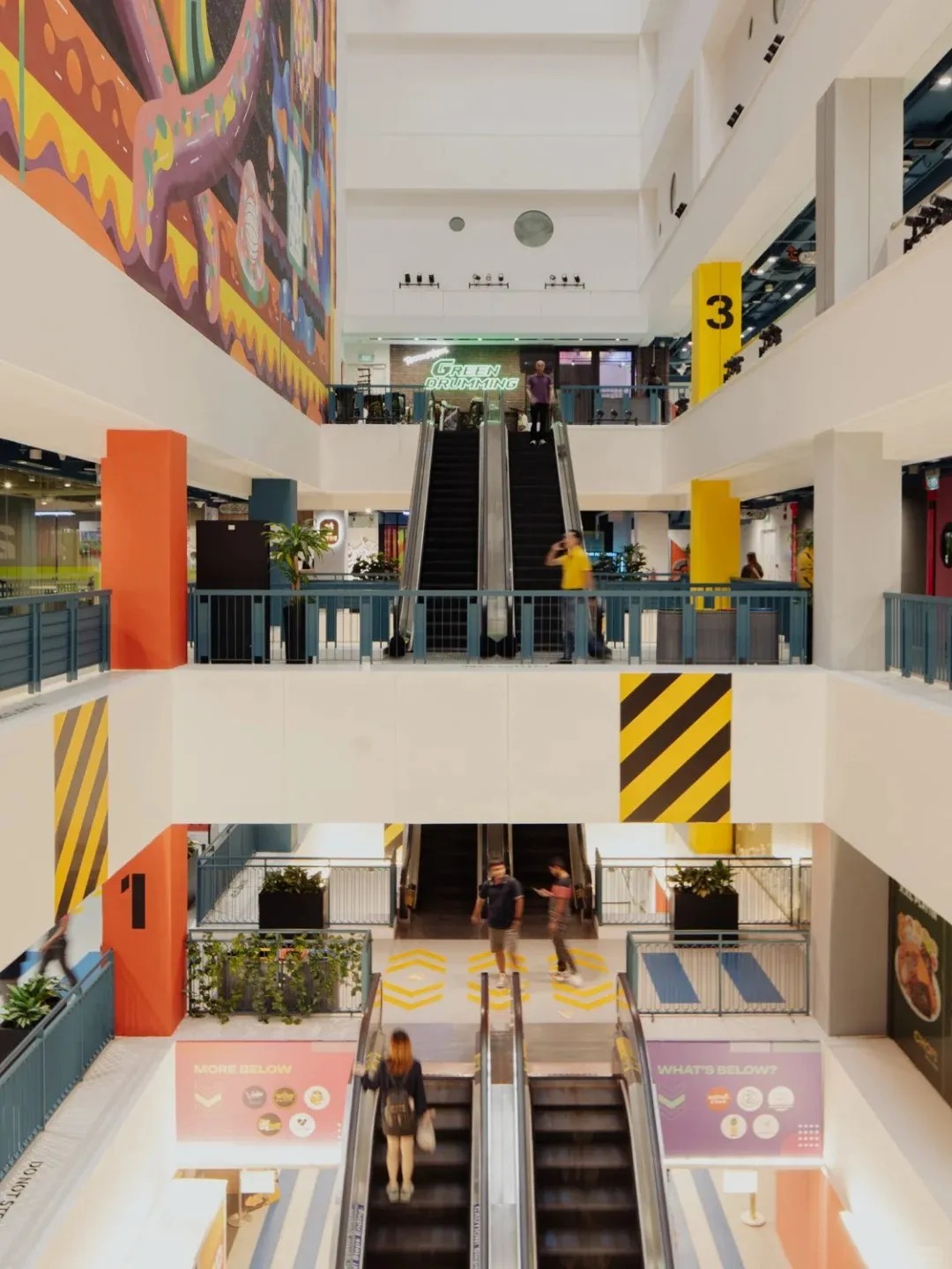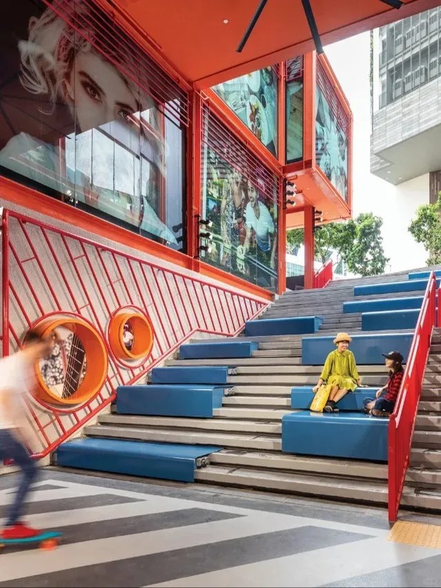 在空間優(yōu)化上,GRiD項(xiàng)目著重打造社交與活躍氛圍。通過引入“社交樓梯”理念,將傳統(tǒng)商鋪空間轉(zhuǎn)變?yōu)榧蓍e、交流與體驗(yàn)于一體的多元功能區(qū)。這些設(shè)計(jì)不僅增強(qiáng)了建筑的視覺吸引力和可識別性,還以鮮明的橙色、藍(lán)色及白色調(diào),為空間注入活力與現(xiàn)代感,使其在城市街角中獨(dú)樹一幟。