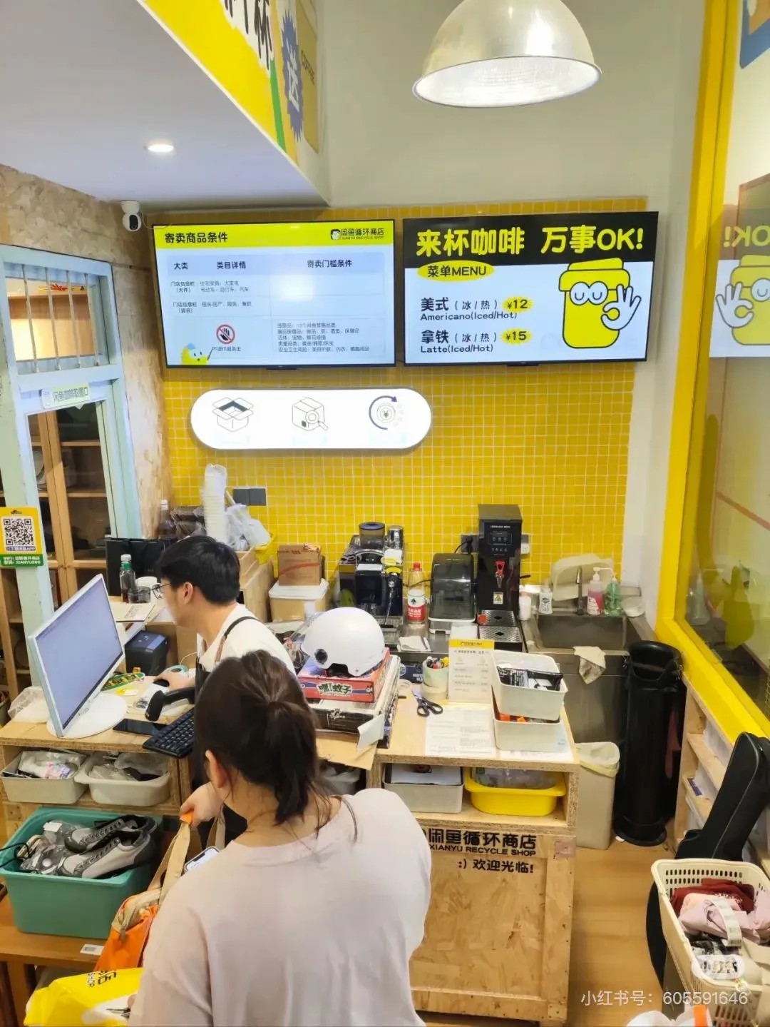 香港慢生活環(huán)保店Slowood,在保證質(zhì)量的前提下,店內(nèi)的所有商品去除一切包裝,或部分產(chǎn)品只采用環(huán)保的可降解材料,沒(méi)有任何塑料和紙張的浪費(fèi);位于杭州絲聯(lián)166文創(chuàng)園的閑魚(yú)循環(huán)商店,門(mén)店以閑魚(yú)APP標(biāo)志性的黃色為主色調(diào),門(mén)頭上標(biāo)注了“寄賣(mài)/二手/咖啡”字樣,門(mén)店屬性十分突出,門(mén)口還擺放了露營(yíng)椅供顧客休息。