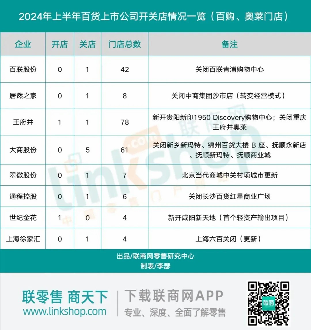 在門店的開設(shè)與關(guān)閉動態(tài)上,2024年上半年呈現(xiàn)出一個顯著的趨勢:關(guān)店數(shù)量遠超開店數(shù)量。具體而言,44家百貨上市公司在此期間僅新增了2家門店(此數(shù)據(jù)僅限于百貨商店、購物中心及奧特萊斯門店),而關(guān)閉的門店數(shù)量則達到了11家。與之形成對比的是,去年同期這些公司開關(guān)店的數(shù)量均為5家。這一變化表明,與去年相比,百貨上市公司在開設(shè)新店方面變得更加謹慎,而關(guān)閉門店的速度卻在加快。