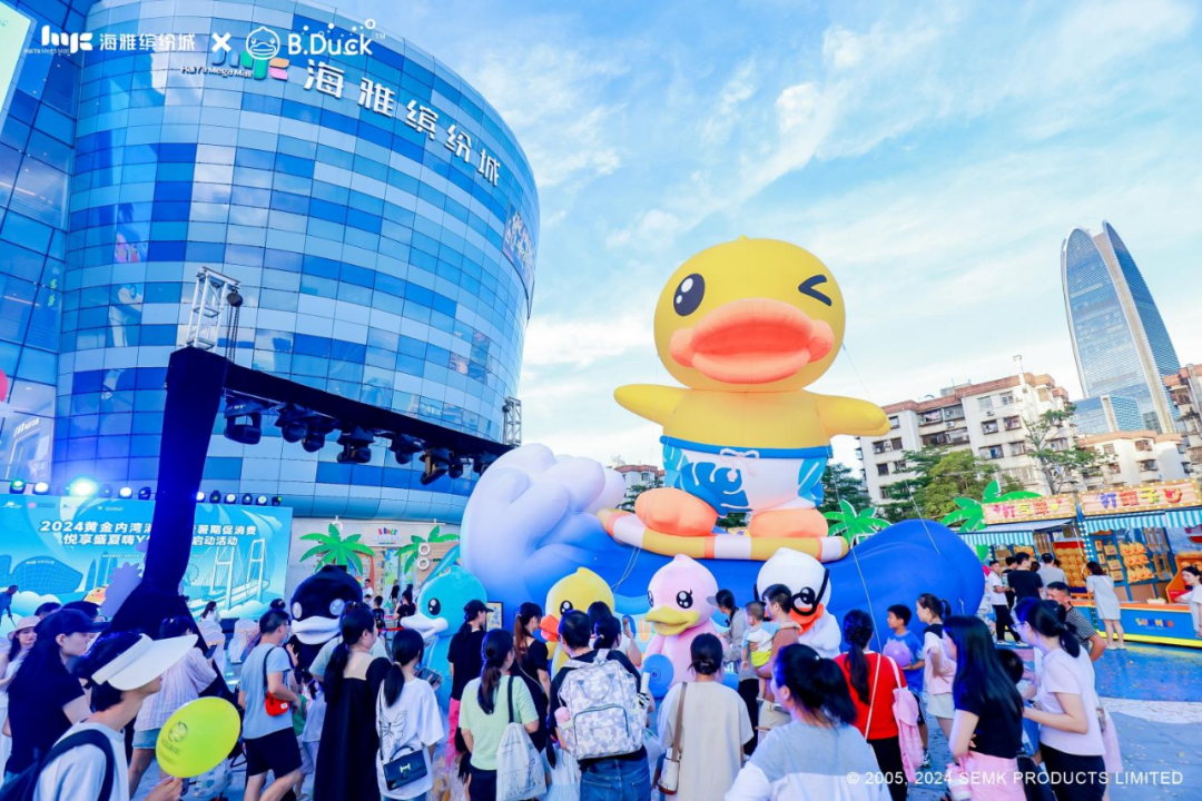 時(shí)值暑期,深圳海雅繽紛城邀請B.Duck品牌創(chuàng)辦人“鴨爸爸”許夏林,以及市/區(qū)商務(wù)局、中山商務(wù)局、新安街道辦、市零售商業(yè)行業(yè)協(xié)會(huì)等官方代表,共同開啟了2024黃金內(nèi)灣消費(fèi)季暨暑期促消費(fèi)——悅享盛夏嗨Ya狂歡購系列活動(dòng)的序幕,成功完成中國第一自主IP B.DUCK小黃鴨的“B.DUCK嗨YA狂歡節(jié)全國首展”。