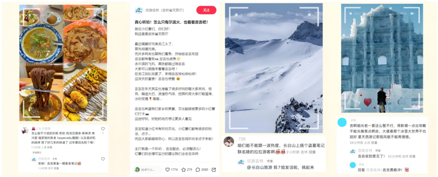 前有吉林文旅在小紅書官方賬號發(fā)布“聽勸求助”筆記,全網征集“吉吉該怎么整活兒”,單條筆記收獲2000+條評論,評論數(shù)量高出其他內容筆記10倍之多。
