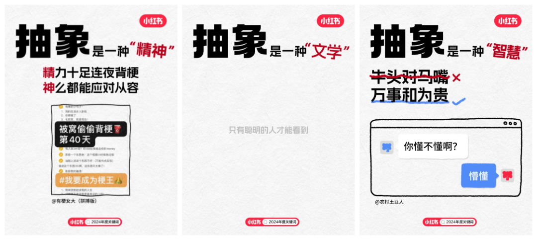隨著2024年度關(guān)鍵詞“搞抽象”在小紅書上的火爆,我們不難發(fā)現(xiàn),無(wú)論是用戶對(duì)于生活哲學(xué)的深度探索,還是對(duì)于藝術(shù)、文化乃至日常瑣碎事物的獨(dú)特詮釋,都以一種前所未有的熱情被記錄與分享。