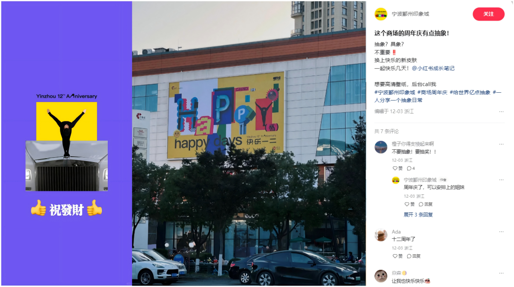 對(duì)于多數(shù)購(gòu)物中心而言,因其目標(biāo)客群相對(duì)寬泛,通過(guò)抽象文化形成“群體認(rèn)同感”的難度比品牌方更高。所以,購(gòu)物中心的抽象式營(yíng)銷,既要出圈,又不能過(guò)于小眾。購(gòu)物中心官方發(fā)布的一條小紅書筆記能讓用戶一眼看懂,并愿意發(fā)聲回應(yīng),如此才是有效“抽象”。
