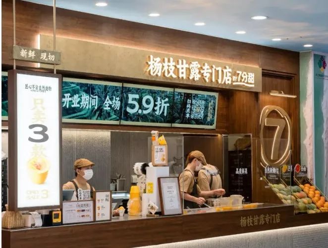 去年,七分甜的首家楊枝甘露專門店在上海長(zhǎng)寧龍之夢(mèng)開業(yè),在產(chǎn)品方面,專門店僅售三款產(chǎn)品,分別是1987經(jīng)典楊枝甘露、2007鮮芒楊枝甘露、楊枝甘露Gelato,分為碗裝、杯裝和冰淇淋,定價(jià)在15-20元。在店型方面,走小店模式,不設(shè)堂食。專門店面積大約只有20平方米左右,目前僅支持下單后排隊(duì)自取。在裝修風(fēng)格上,店內(nèi)裝修以原木配色為主,主打簡(jiǎn)約風(fēng)。在鮮果陳列區(qū)擺放了制作楊枝甘露所需要的椰子、芒果、西柚等原料,采用明檔吧臺(tái)在顧客面前現(xiàn)切現(xiàn)做,讓消費(fèi)者直觀感受產(chǎn)品的制作流程。
