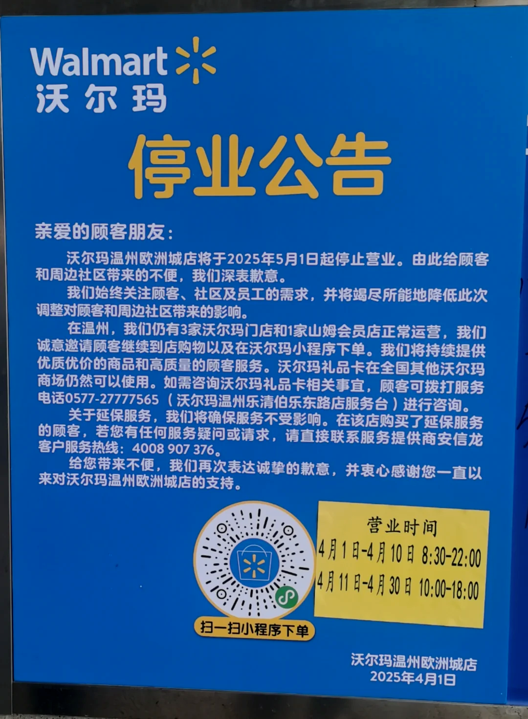 行至2025年,除了如胖東來、山姆等商超企業(yè),超市行業(yè)的生意依然難做。4月1日,沃爾瑪溫州市區(qū)最后一家門店宣布將于5月1日停業(yè),該店是繼沃爾瑪東海店、沃爾瑪鴻瑛店之后,溫州市區(qū)營(yíng)業(yè)的唯一一家實(shí)體店。在關(guān)閉門店的公告中,沃爾瑪明確表示,關(guān)店原因主要?dú)w結(jié)為戰(zhàn)略調(diào)整以及合同或租約到期。其中廣州新港店,由于所在商城整體改造升級(jí),預(yù)計(jì)今年10月將重新開業(yè)。