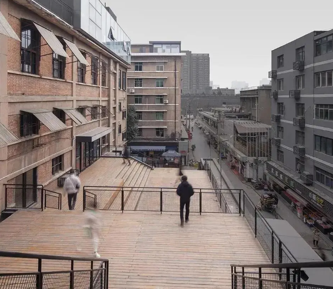 作為發(fā)起點(diǎn),現(xiàn)有菜場(chǎng)部分被完全保留。項(xiàng)目最核心的“修補(bǔ)”有三處:連接市場(chǎng)入口與1、2號(hào)樓的臺(tái)階廣場(chǎng),連接地面層與2號(hào)樓屋頂?shù)慕煌ㄍ?,以及連接2號(hào)樓屋頂和3號(hào)樓的連橋。開(kāi)敞的臺(tái)階廣場(chǎng)層層上行,不僅引導(dǎo)人流進(jìn)入上層空間,還成為了菜場(chǎng)公共生活的舞臺(tái)。同時(shí),廢舊廠房改造成了如今免費(fèi)開(kāi)放的藝術(shù)展區(qū),這里不定期會(huì)舉辦各式不同主題的展覽活動(dòng),已經(jīng)成為新晉網(wǎng)紅打卡盛地。