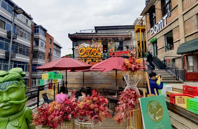 其中,信義巷子主要匯集特色小鋪,一樓布滿如陜西特產(chǎn)、小磨香油、新鮮肉鋪等門(mén)面,二樓則由咖啡館、美甲店等小店組成。每家店鋪?lái)敳慷加袘覓炖喜藞?chǎng)統(tǒng)一設(shè)計(jì)的小旗幟,既和諧統(tǒng)一又各含特色;有戲主題板塊主要以脫口秀,劇本殺,婚禮,攝影及文創(chuàng)手工等工作室等業(yè)態(tài)為主,以“有戲”為名也代表著希望,象征著新銳市井文化的希望;悅夜板塊,主要匯集酒吧、民宿等多種休閑元素。尋味板塊,則提供少燒烤、韓料、特色小吃等餐飲。