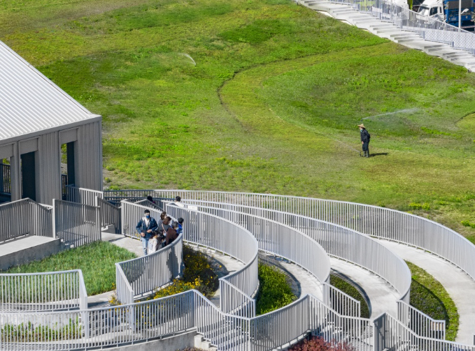 在建設(shè)空間設(shè)計(jì)上,項(xiàng)目將市場(chǎng)與公共綠地完美融合,摒棄了傳統(tǒng)菜市場(chǎng)簡(jiǎn)單金屬棚的形式,屋頂打造為被草地和花田覆蓋的公園。建筑呈現(xiàn)為一個(gè)簡(jiǎn)單的開(kāi)放式結(jié)構(gòu),起伏的綠色屋頂猶如延綿的山丘,屋頂?shù)臇|側(cè)角落是一塊種植著繽紛植物和花卉的階梯狀區(qū)域,屋頂從該側(cè)向下延伸至地面,使游客可以輕松到達(dá)建筑頂端。在建筑的側(cè)面,一個(gè)簡(jiǎn)單的四層結(jié)構(gòu)容納了市場(chǎng)的行政辦公室和展覽中心,后者可用于展示當(dāng)?shù)氐霓r(nóng)業(yè)產(chǎn)品。