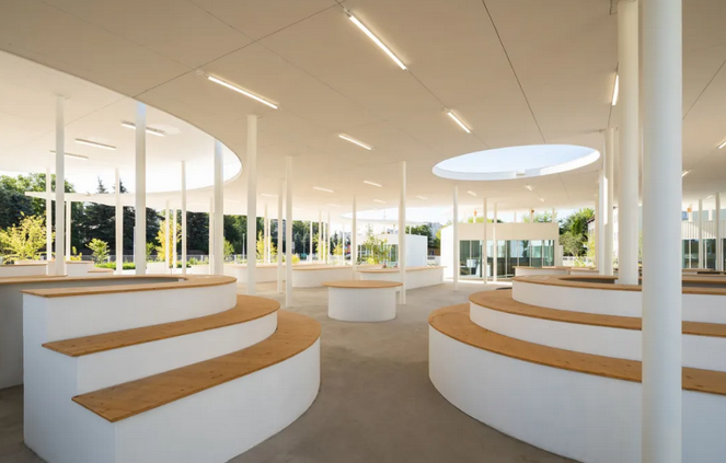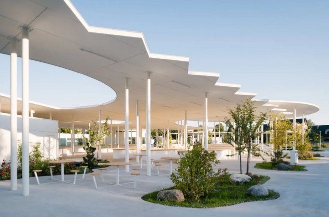 此外,廣場(chǎng)光滑的混凝土面層沒(méi)有路緣石,無(wú)論是步行、坐輪椅還是滑滑板都可以在市場(chǎng)上安全自由地移動(dòng),方便了不同人群的使用,體現(xiàn)了設(shè)計(jì)的人性化和包容性;各種街道固定裝置如白色的圓形信息板、自行車(chē)架、巨石、鳥(niǎo)類(lèi)和昆蟲(chóng)屋及社區(qū)共用桌椅等點(diǎn)綴其中。在極具特色的有機(jī)屋頂下,還設(shè)有帶木雕動(dòng)物造型搖椅的游樂(lè)花園,為集市增添了藝術(shù)氛圍和趣味性。